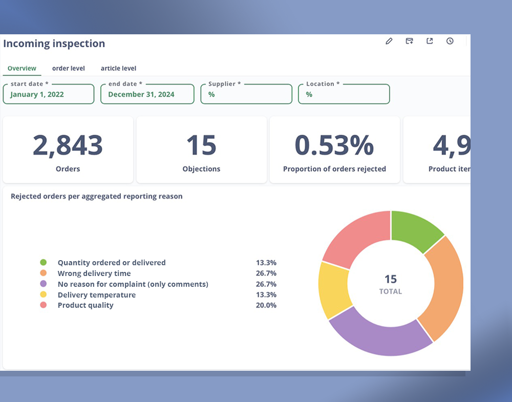 “Incoming goods inspection” enables a precise analysis of the quality of deliveries. It provides detailed information on complaints, which be filtered by location, supplier and time period. A comprehensive breakdown at order and item level and an overview of the overall frequency help to identify problems quickly. Specific complaints can be examined and comments viewed using the drill-down function. The dashboard also provides trend analyses on the development of complaints over time.