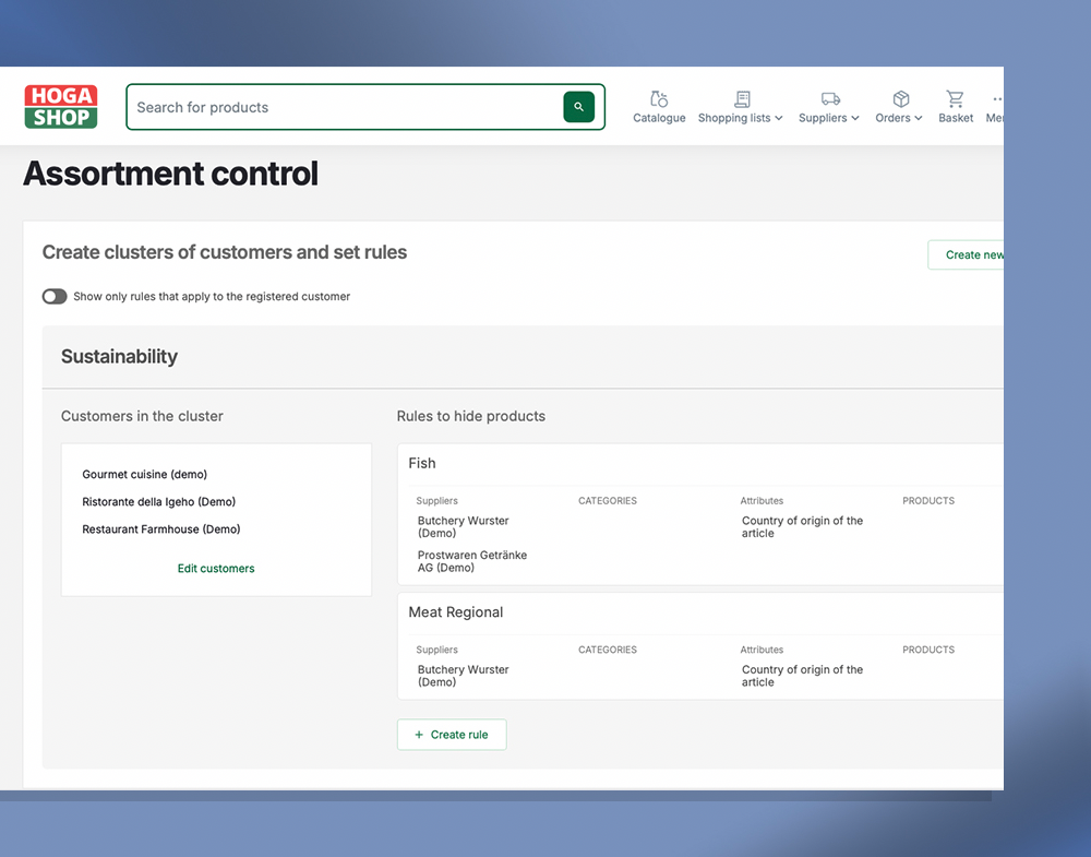 Assortment control ensures that businesses are only shown products that meet specified sustainability standards. Clear rules can be defined for this purpose – for example, based on labels, specific countries of origin, or the Green Handshake.t
