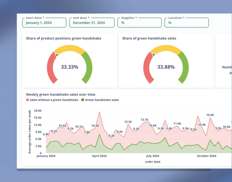 The HOGA Cockpit enables transparent evaluation of the Green Handshake across all businesses. The target share of sustainable purchases can be analyzed directly. With filters for suppliers, businesses, and time periods, developments in sustainable purchasing can be identified and reports generated at the touch of a button.
