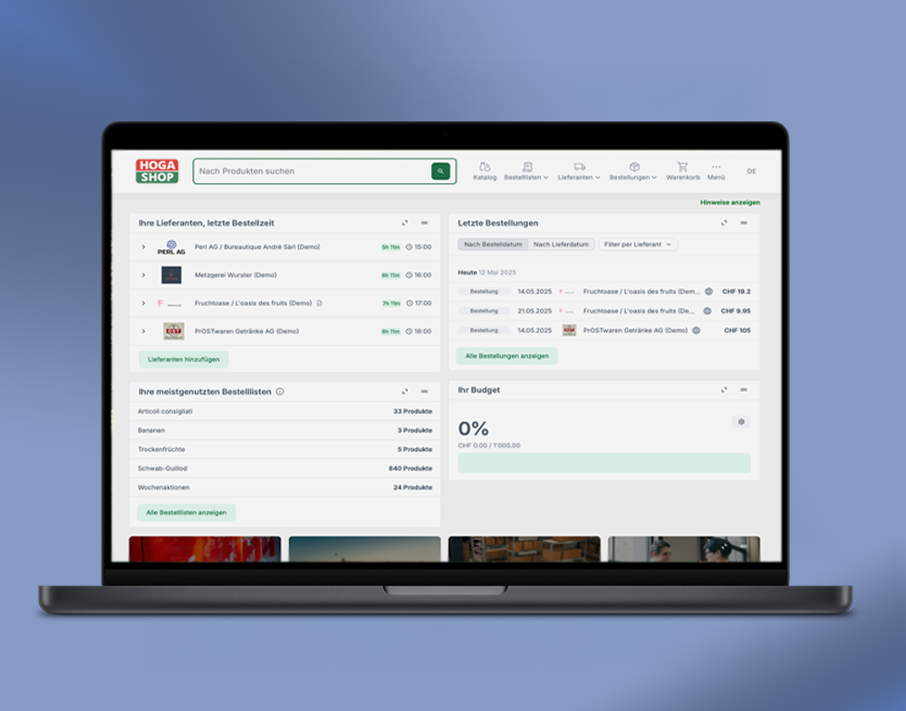 Die Plattform bietet Ihnen einen schnellen Überblick über Ihre Lieferanten, Bestellhistorie, meistgenutzte Produkte sowie Ihr Budget. Dank intelligenter Funktionen wie Filter, Favoriten und Sammelbestellungen optimieren Sie Ihre Beschaffungsprozesse und behalten stets die Kontrolle.