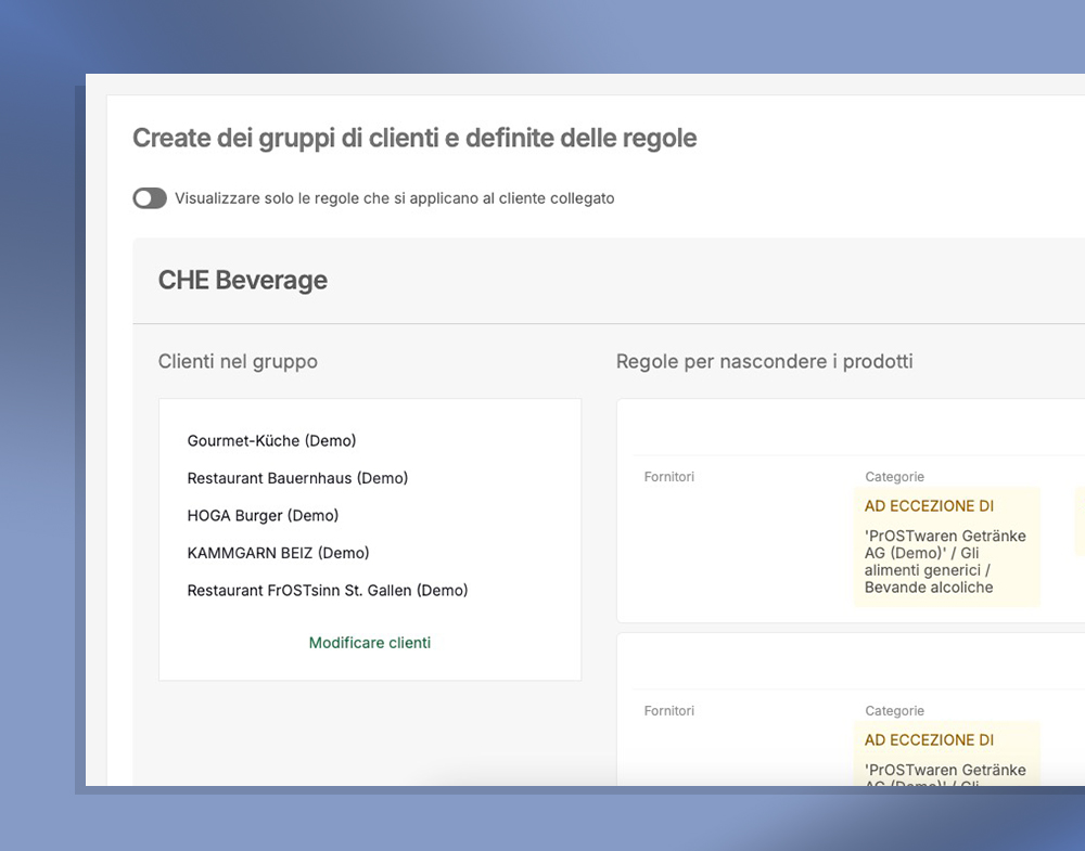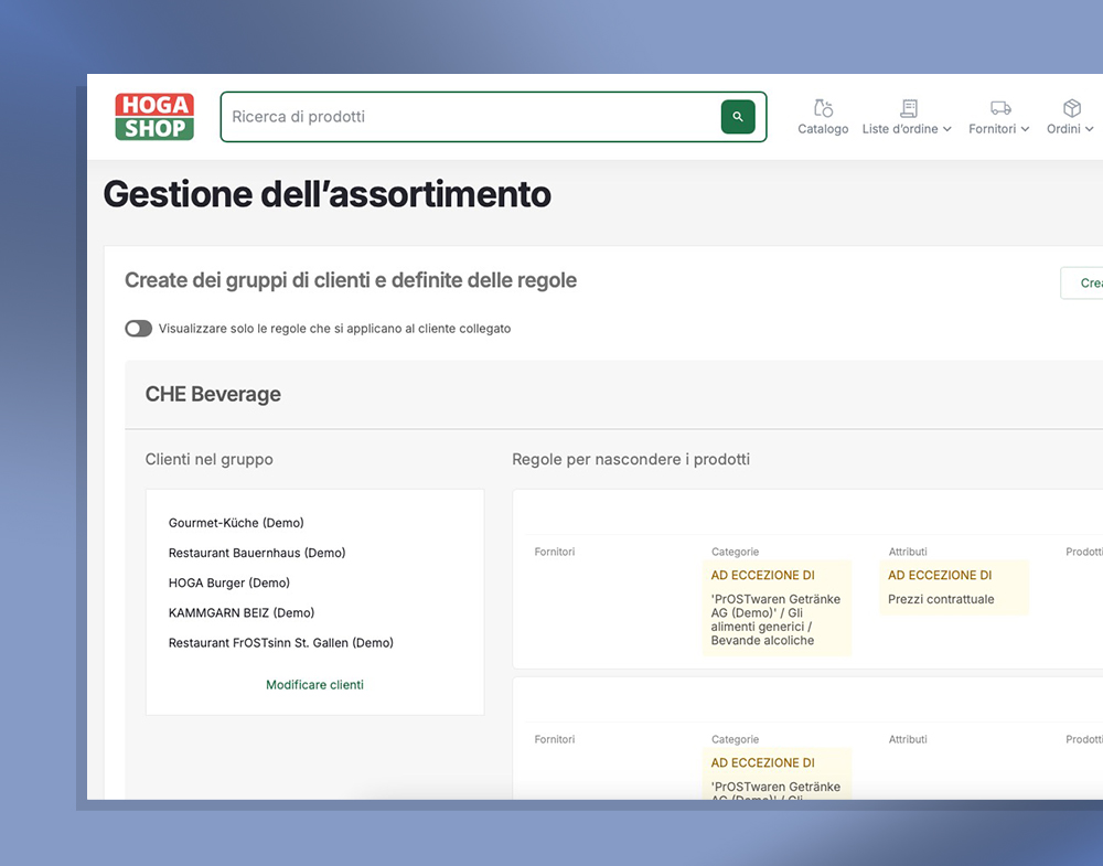 La gestione dell’assortimento consente di organizzare le aziende in gruppi e di definire regole di acquisto specifiche. In base alla sede, alla struttura aziendale o ad altri criteri, l’assortimento può essere controllato in modo mirato.