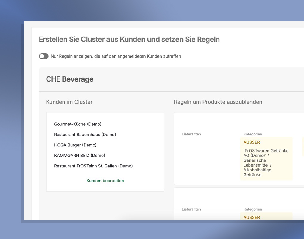 Mit der Sortimentssteuerung lassen sich Betriebe in Gruppen organisieren und spezifische Einkaufsregeln definieren. Ob nach Standort, Unternehmensstruktur oder anderen Kriterien – das Sortiment kann gezielt gesteuert werden.